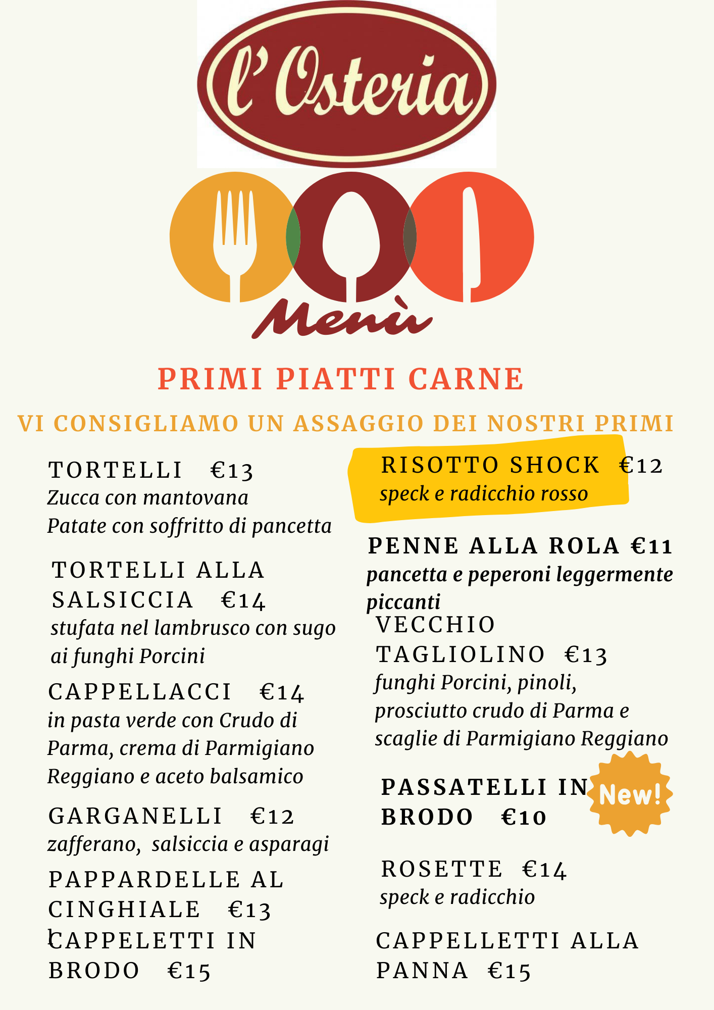 Le specialità dell’Osteria emiliana sono i piatti della cucina locale emiliana, dagli antipasti di salumi e formaggi accompagnati dal famoso gnocco fritto e tigelle ai primi di pasta fresca, fatta in casa, come tortelli, tortelloni, ravioli alla zucca, tagliatelle al ragù o con diversi condimenti. Il menù fisso è la scelta ideale per assaggiare un tris di primi e un secondo accompagnato da gnocco fritto e tigelle (piatti della tradizione contadina) e per concludere con caffè e dolci artigianali: torte fatte in casa e amaretti appena sfornati. Un menu ricco di proposte per farti venire l’acquolina in bocca: vieni a trovarci per assaggiare i sapori più autentici della cucina emiliana!